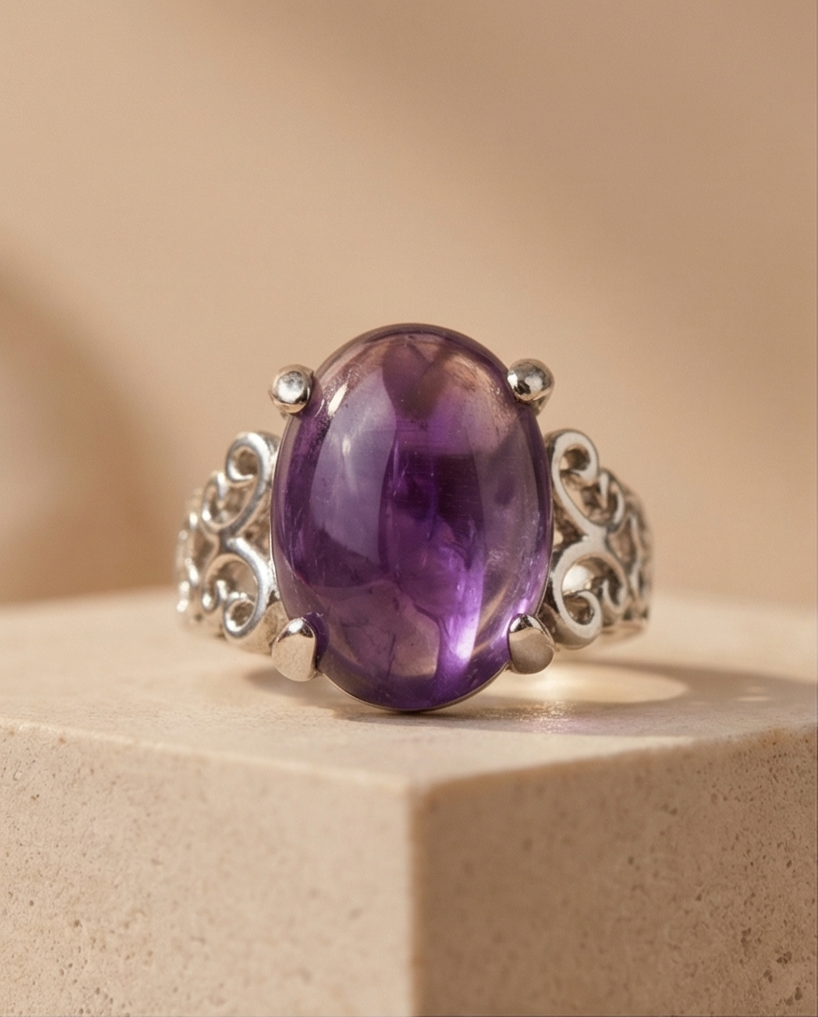L’élégance à l’état pur. Succombez au charme de cette magnifique bague en améthyste naturelle, une pièce d’exception pour sublimer votre style.