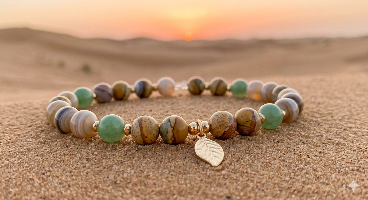 - L’Agate du Désert : Avec ses rubans naturels aux tons sable et crème, elle apporte stabilité et ancrage.