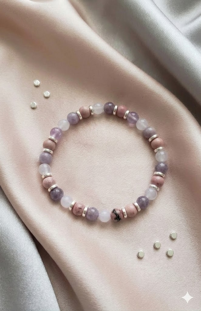 Composition : Perles de 6mm en pierres naturelles (Rhodonite, Améthyste lavande, Lépidolite).
