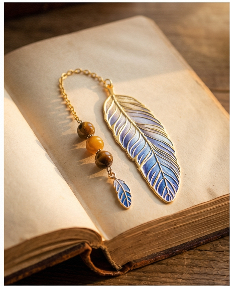 Marque page Plume et pierres Oeil du tigre doré