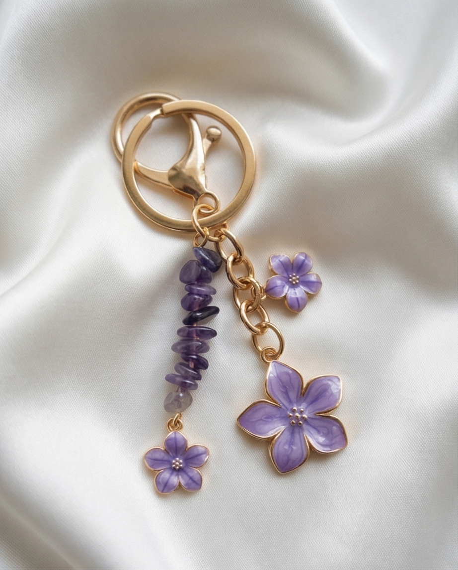 Laissez la douceur vous accompagner partout avec notre nouveau porte-clé fleuri. Alliant l’élégance de l’émail mauve et la puissance vibratoire de l’Améthyste, il est une invitation au calme et à la clarté d’esprit au quotidien. ✨
