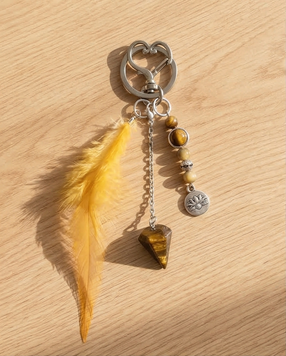 Porte clés pendule oeil du tigre plume
